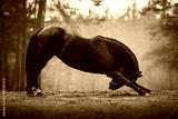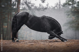 black mare horse in leather halter bowing on the forest road in autumn landscape