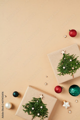 Gift boxes with handcrafted Christmas decor on cozy beige background with baubles and decorations