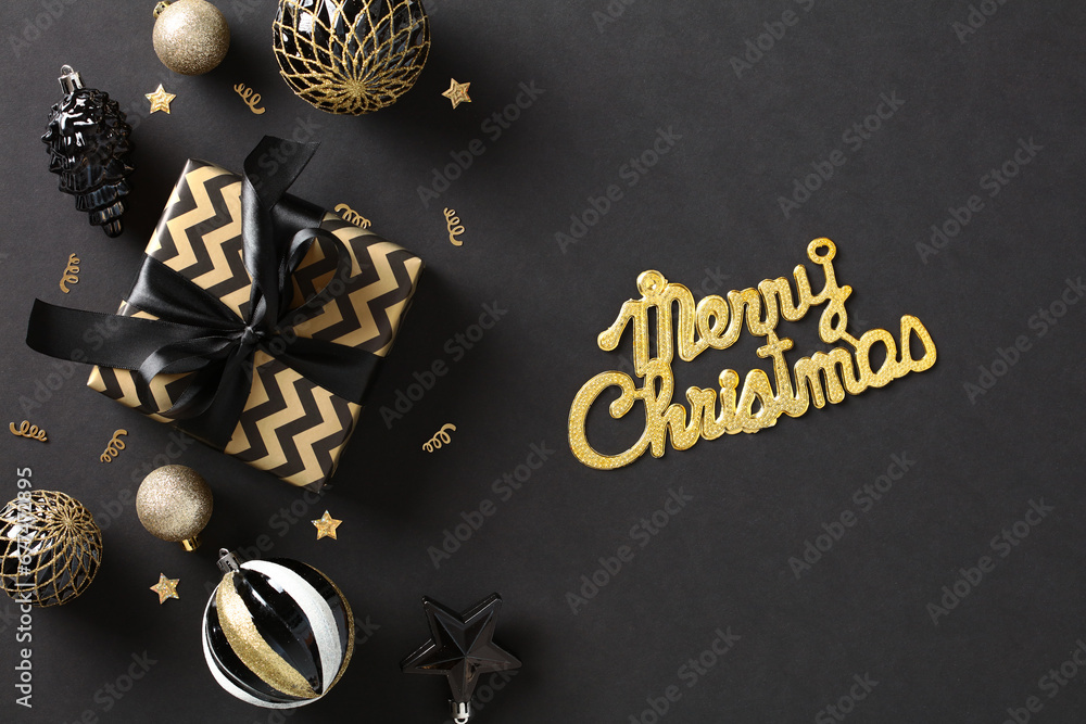 Chic Christmas composition with elegant art deco style decorations. Golden confetti, glittering ornaments, and a black background create a festive atmosphere. Perfect for holiday cards, party invite
