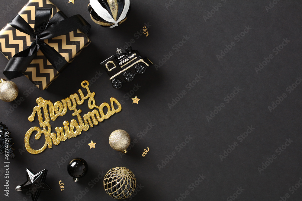 Elegant holiday flat lay composition with golden ornaments, confetti, and a chic black backdrop. Festive design for Christmas and New Year celebration. Luxury, modern, and stylish. Merry Xmas