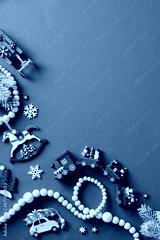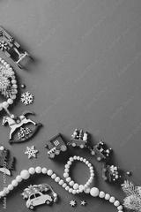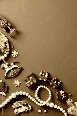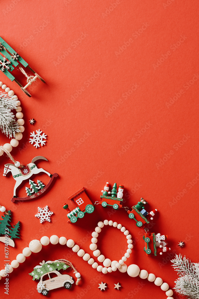 Vintage Christmas toys on red background. Cozy composition featuring retro wooden ornaments, wooden sleigh, train and festive garland. Elegant holiday decor for cards, banners, and more