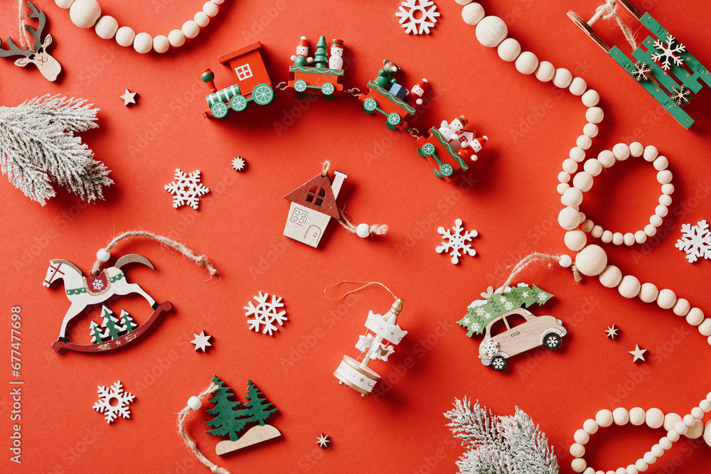 Vintage Christmas composition with festive decor, retro toys, and a wooden train. Cozy and elegant holiday flat lay. Merry Xmas and Happy New Year card design in a nostalgic setting.