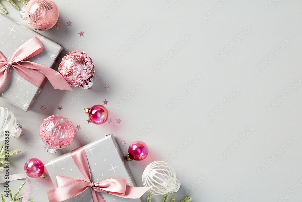 Christmas card with elegant pink and grey presents, glass baubles, and fir branches. Modern holiday composition on a grey background. Fashionable, stylish, and creative design for the festive season