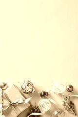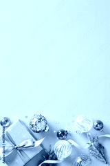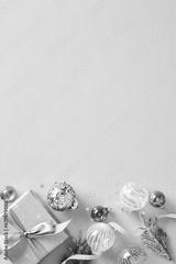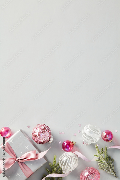 Modern and elegant Christmas composition. Stylish vertical banner featuring glittering baubles, gift box with luxury bow. Ideal for cards, invitations, and seasonal decorations. Fashionable flat lay