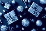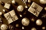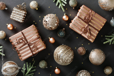 Chic and elegant Christmas flat lay composition featuring glittering baubles luxury gift boxes on stylish black background. Ideal for cards, banners, and festive invitations