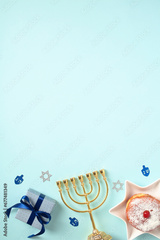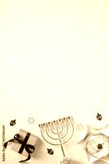 Happy Hanukkah holiday concept with traditional Jewish symbols: golden menorah, gift box, jam donut. Chanukah composition for greeting card or banner