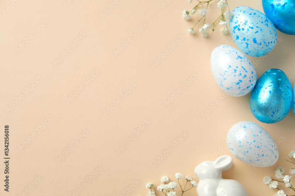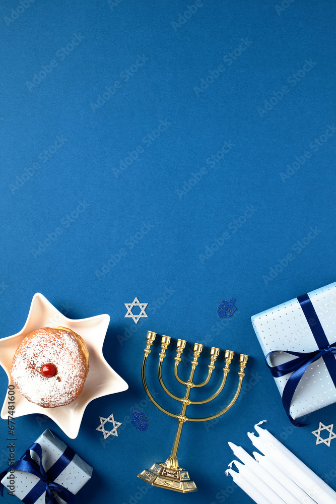 Blue background with festive Hanukkah composition. Menorah, gift boxes, candles, jelly donuts on blue table. Traditional Jewish holiday celebration. Chanukah greeting card concept