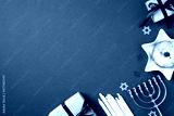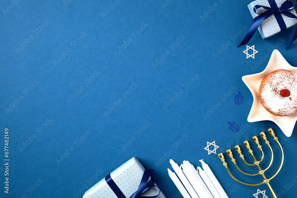 Hanukkah celebration photo with festive menorah, sufganiyot, candles, and gift boxes on a blue background. Perfect for holiday card, banner, or invitation. Jewish culture and tradition composition