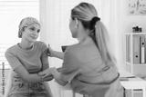 Teenage oncology patient talking with doctor. Oncologist treating teen girl with cancer and provide emotional support, helping her with anxiety and depression.