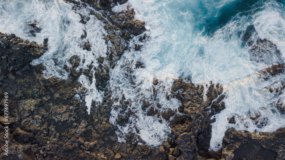 Drone view of Tenerife south coast with Atlantic ocean and strong swell beating against the walls of a rocky cliff, blue rough sea with big waves with foam crashing against the rocks