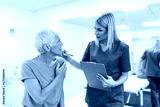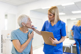 Woman doctor osteopath in medical uniform fixing senior woman patients shoulder and back joints in manual therapy clinic during visit. Professional osteopath during work with patient concept