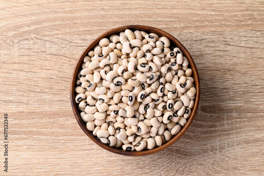 Black eye peas or cowpeas in bowl on wooden background, Food ingredients, Table top view