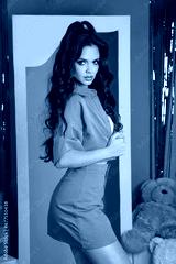 Party. Event. Beautiful model doll posing with long hair style, young girl full portrait in glamour fashion outfit.