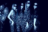 Attractive fashion women models in sunglasses. Wild Group of girls dancing at party at night club isolated on black bacground.