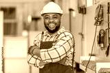 Carpenter man Portrait of Young black skin looking smile laugh to camera in workshop. Happy professional Carpenter holds wooden planks for build furniture in carpentry workshop. one carpenter worker