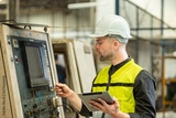 One man professional engineer worker technician checking old machine construction factory for maintenance. factory assistant worker in helmet check inspect old machinery construction in old factory.