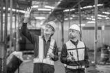 Two professional engineer worker technician checking old machine construction factory with colleague technician. factory assistant worker in helmet check old machinery construction in old factory.