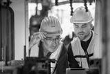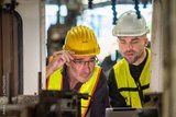 Two professional engineer worker technician checking old machine construction factory with colleague technician. factory assistant worker in helmet check old machinery construction in old factory.