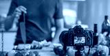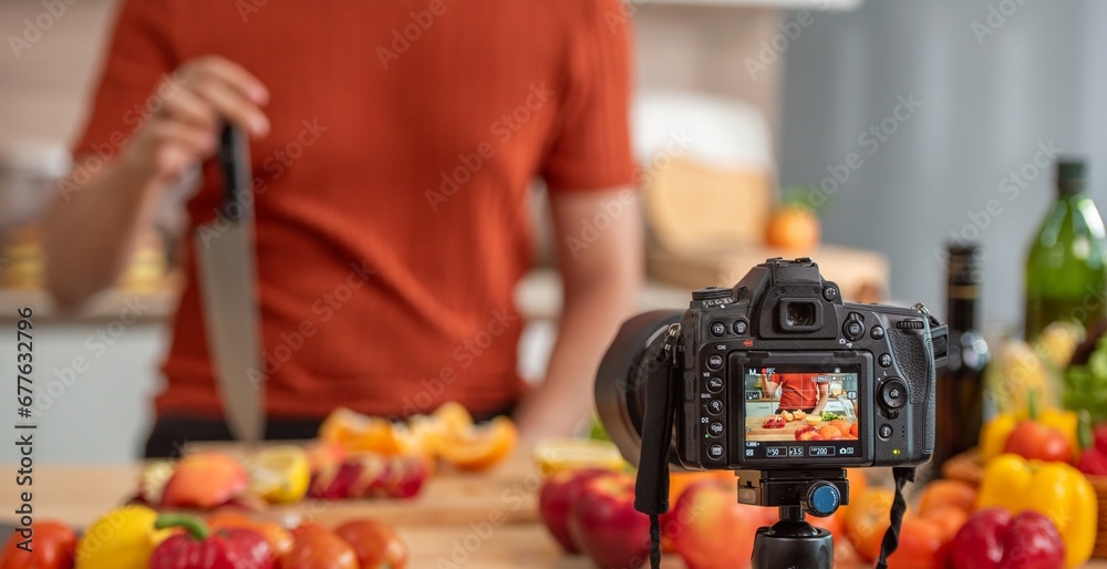 videographer record video clip back screen video recording by camera and smartphone to online social internet live. Vlogger watching recording clip streaming online a man preparation food salad.
