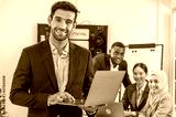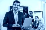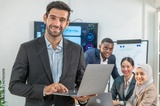 businessman leader supervisor and manager smile and carry hold notebook tablet in office company. leader senior manager looking and carry laptop in meeting room multiracial teamwork background.
