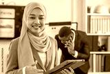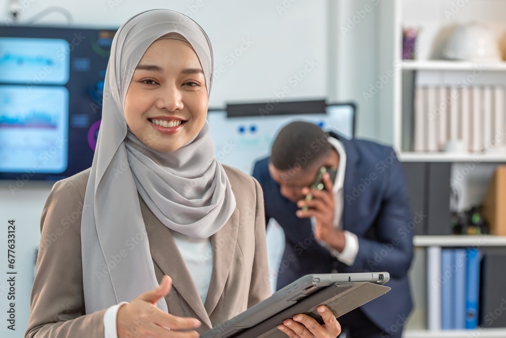 Asian muslim businesswoman leader supervisor smile and carry hold notebook tablet in office company. muslim businesswoman manager carry laptop in meeting room multiracial teamwork background.