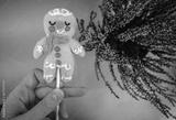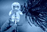 Homemade traditional Christmas cookie with icing on blue background flalty. Delicious gingerbread man in female hand. New Year 2024 doll, toy, sweet in a child hand. Pink flowering heather blooming.