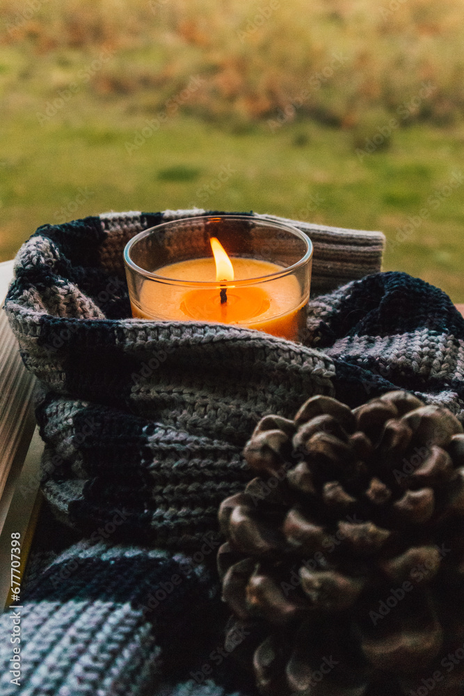 Orange scented wax candle in a glass tumbler wrapped in a knitted scarf or sweater with a green natural background. Pine cone. Cozyness of a rustic house. Village lifestyle. Slow living concept.