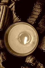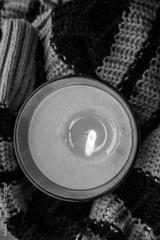 Orange scented wax candle in a glass tumbler wrapped in a knitted scarf or sweater with a green natural background. Pine cone. Cozyness of a rustic house. Village lifestyle. Slow living concept.