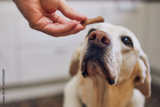 Man with his obedient dog at home. Cute labrador retriever looking up at his pet owner hand giving him cookie as reward. Selective focus on snout..