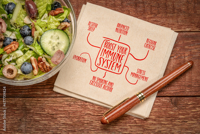 boost your immune system - mind map sketch on a napkin with a bowl of salad, healthy habits and lifestyle concept
