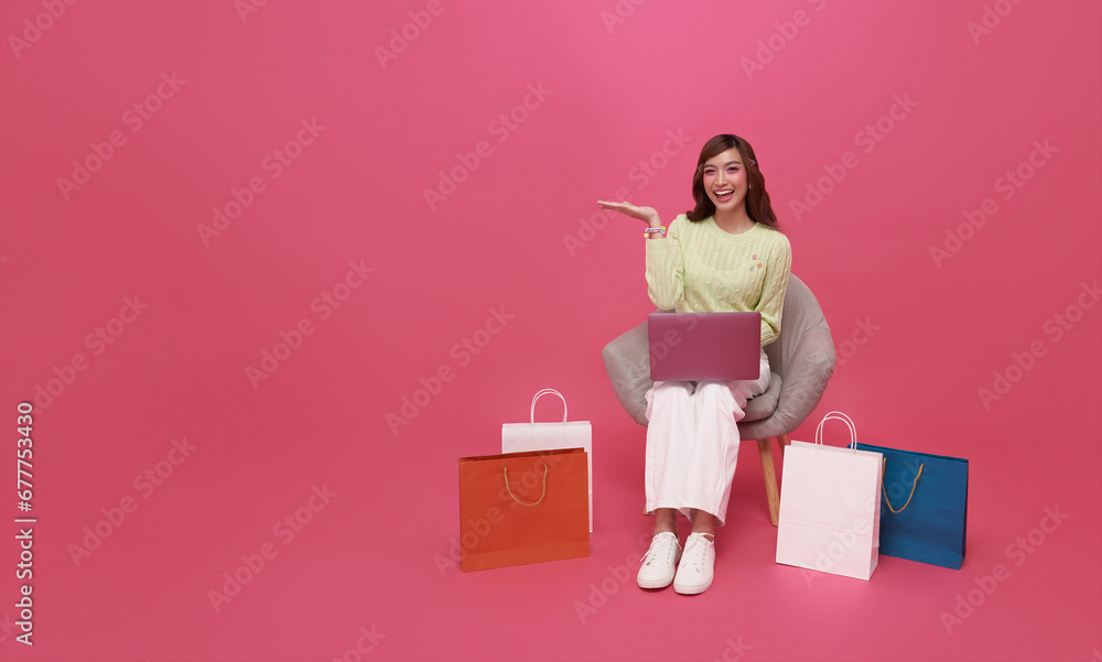 Happy Asian teen woman sitting on sofa with shopping bags using laptop shopping online isolated on pink copy space background.
