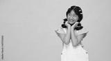 Portrait of happy Asian kid child girl thinking idea and looking up to copy space isolated on nude color background.