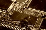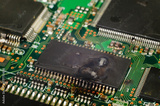 Electronic integrated circuit (IC) on a computer PCB after suffering a catastrophic static discharge and burn out