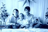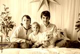 Happy family, children and mom, taking family pictures in a cozy christmas studio