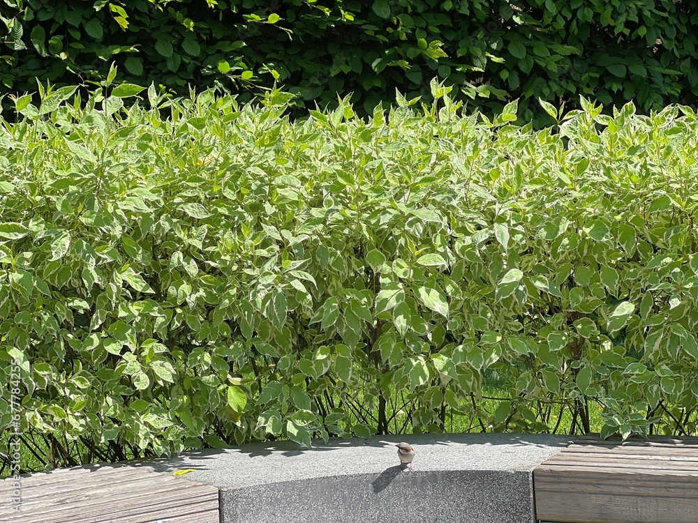 Park bench and ornamental shrubs, trees.