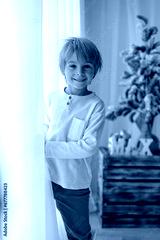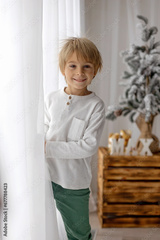 Beautiful blond child, young school boy, writing homework for school in a decorated home, drinking milk and eating cookies