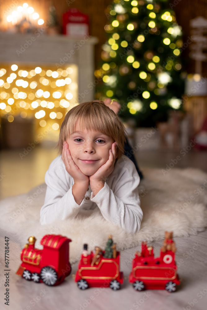 Beautiful blond child, young school boy, writing homework for school in a decorated home, drinking milk and eating cookies