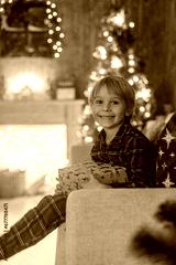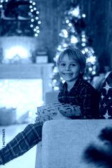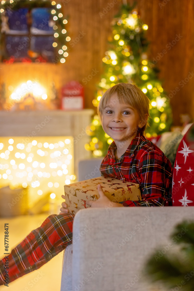 Beautiful blond child, young school boy, writing homework for school in a decorated home, drinking milk and eating cookies.