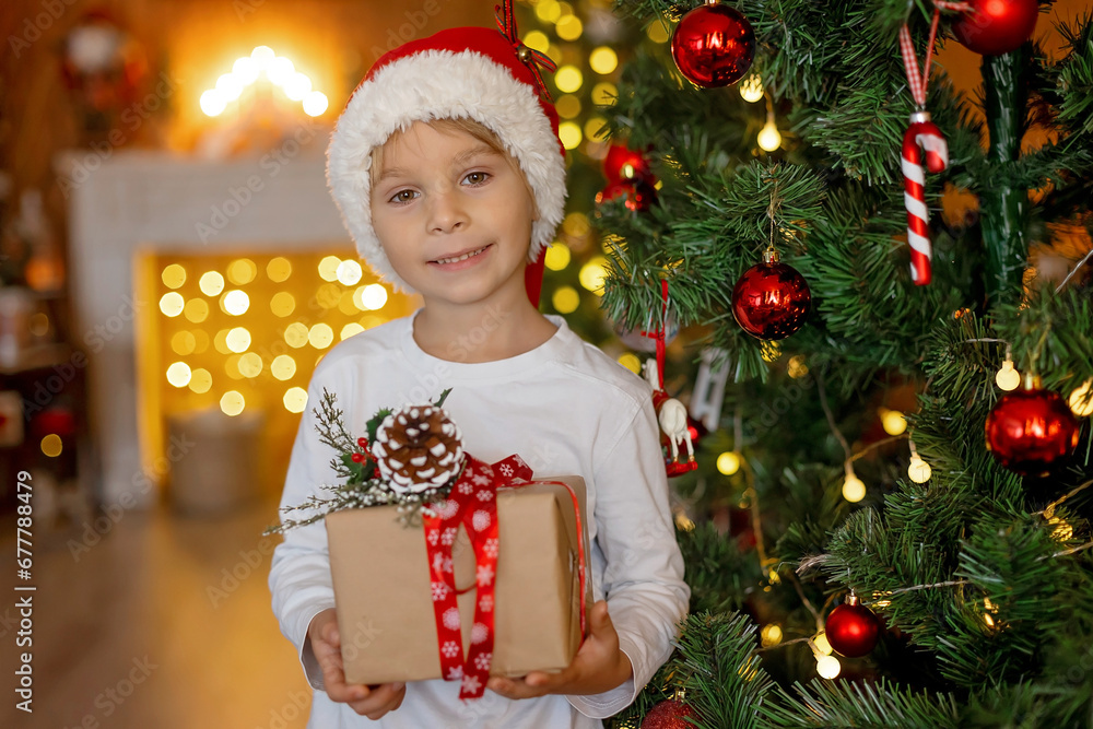 Beautiful blond child, young school boy, writing homework for school in a decorated home, drinking milk and eating cookies