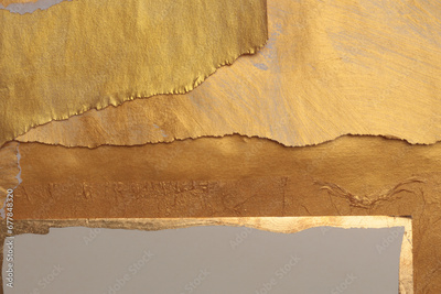 Gold, bronze and beige paper collage paper frame painting wall. Abstract glow texture copy space relief background.