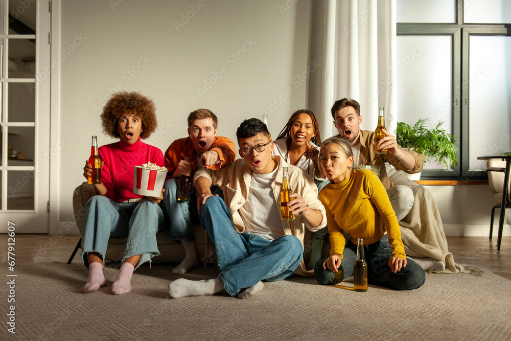 multiracial group of young shocked friends sitting on sofa at home drinking beer and watching TV in amazement