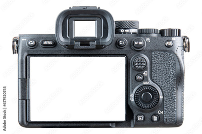 Photo camera. Digital or Dslr camera. Photographer or videographer studio equipment for recording video film project. Professional blogger, television camera. Camera, display. Isolated background