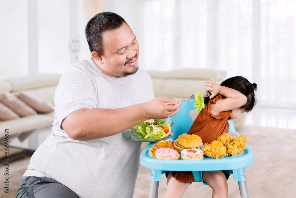 LIttle girl rejected a bowl of salad and prefer to eat junk food