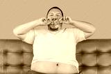 Greedy overweight man eating fried chicken - junk food while sitting on sofa