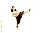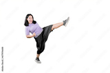 Full length portrait of an overweight asian woman kicking