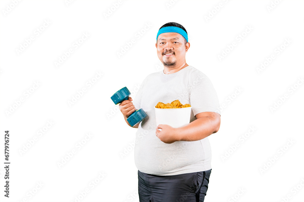 Young asian guy holding a bucket of fried chicken and a dumbbell