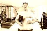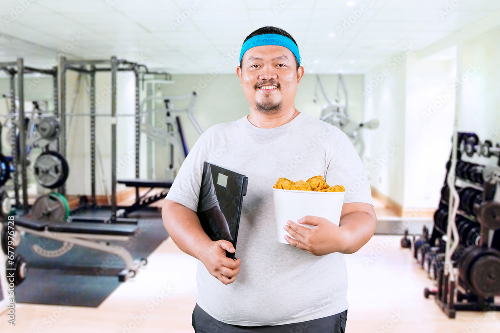 Asian overweight guy wearing head band while holding a bucket of fried chicken and a scale in a gym