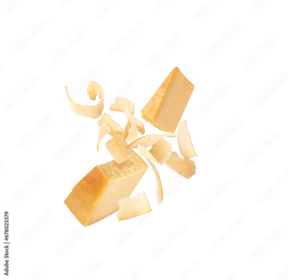 parmesan cheese slices and pieces in dynamics on a white background