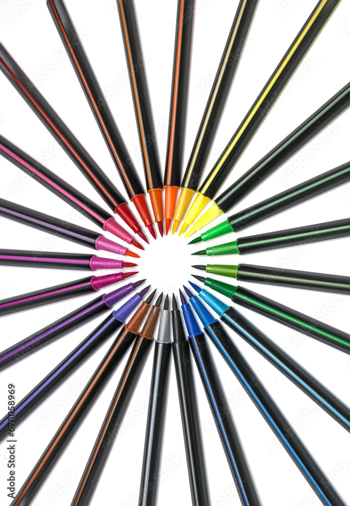 A set of bright multi-colored felt-tip markers lie in a circle,