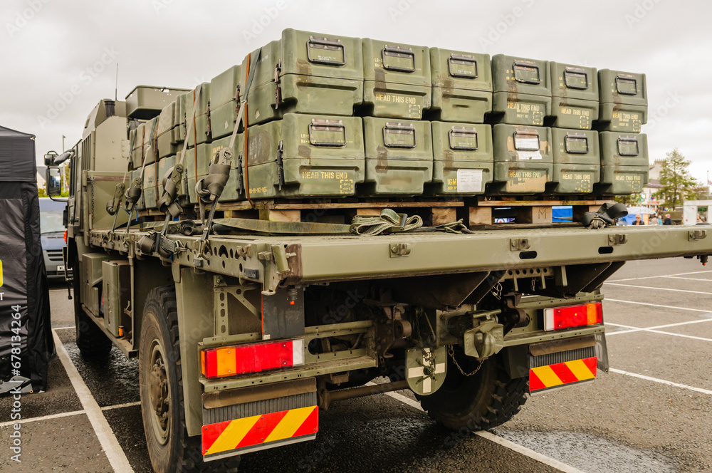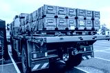 Boxes (inert) for anti-tank missiles on back of a flat-bed lorry.